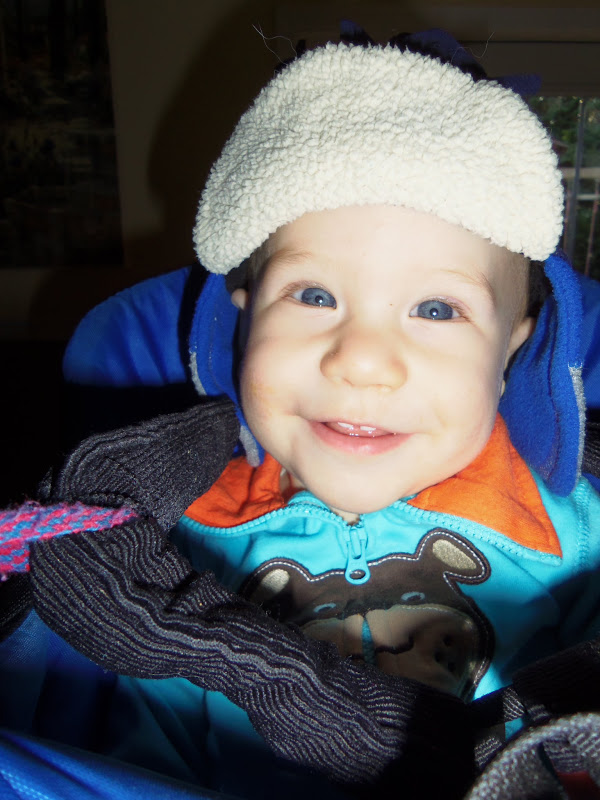 This was quite a month of milestones for my big 8 month old boy! He got two more upper teeth, started crawling on his knees more than army style (about two days after he turned 8 months old), starts really mimicing sounds, says hi and more, starting to learn and understand some sign language, pulls himself to stand, plays peek a boo, drinks out of a straw, claps his hands, is learning what no means, and is also learning to not put everything in his mouth. Whew!